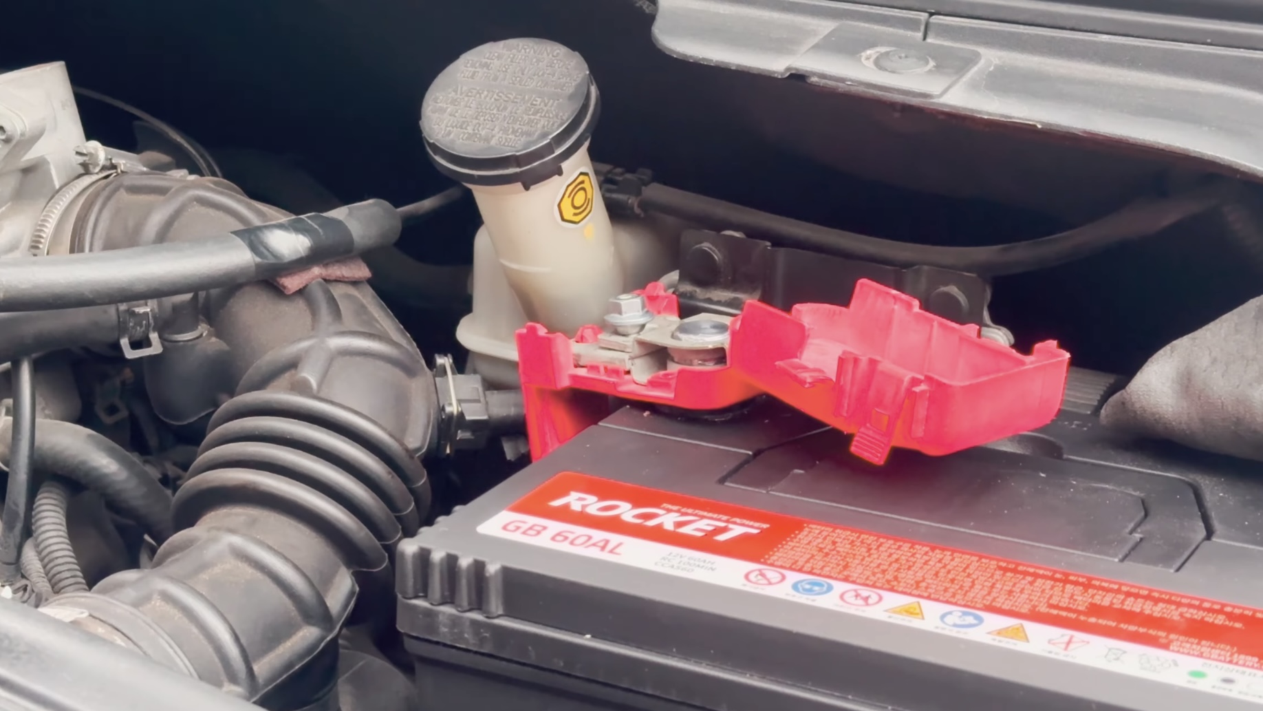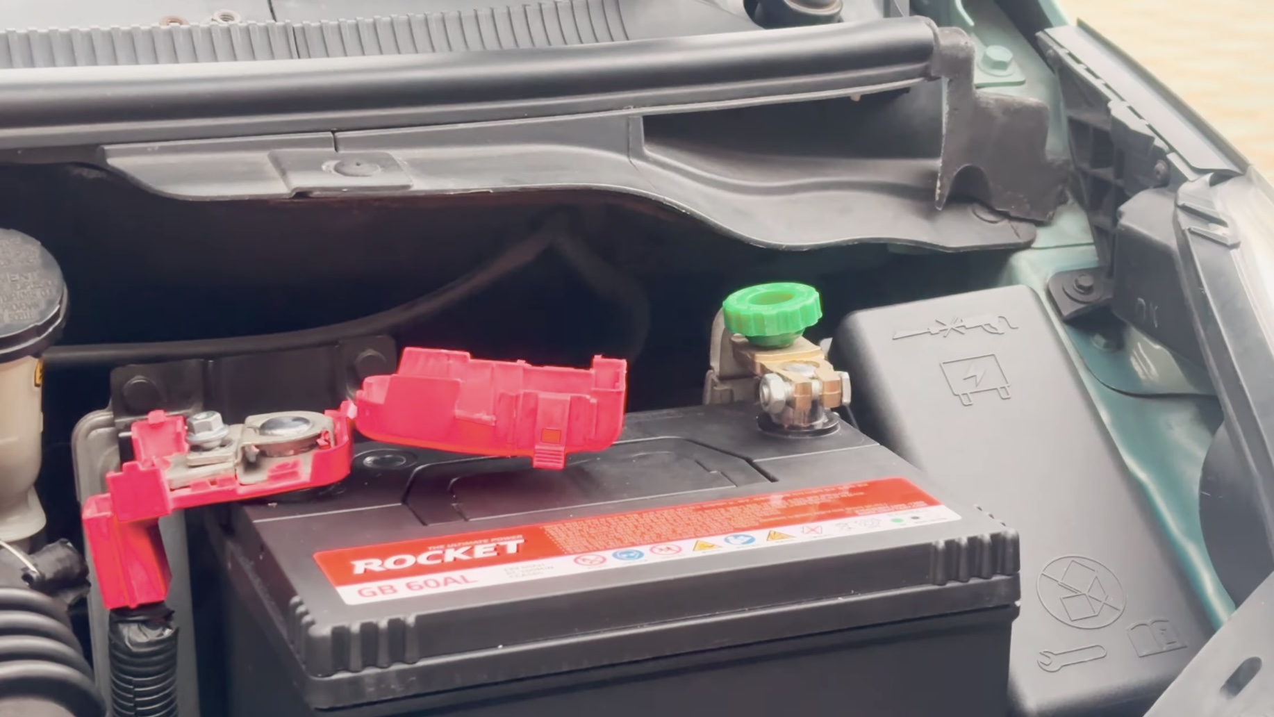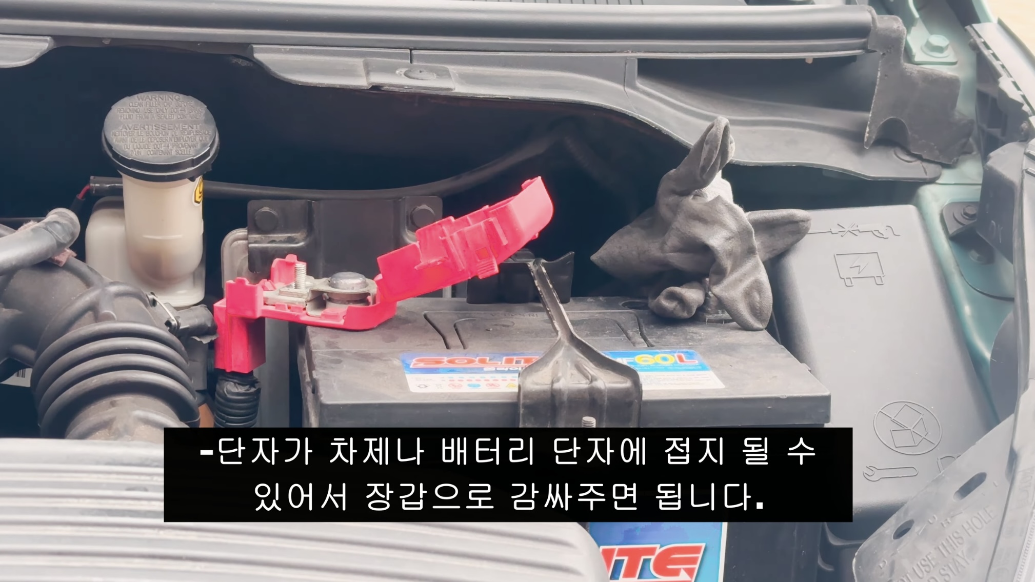 2. 자동차 보닛을 열고 폐배터리(기존 배터리)에 연결된 + 단자를 분리한다.