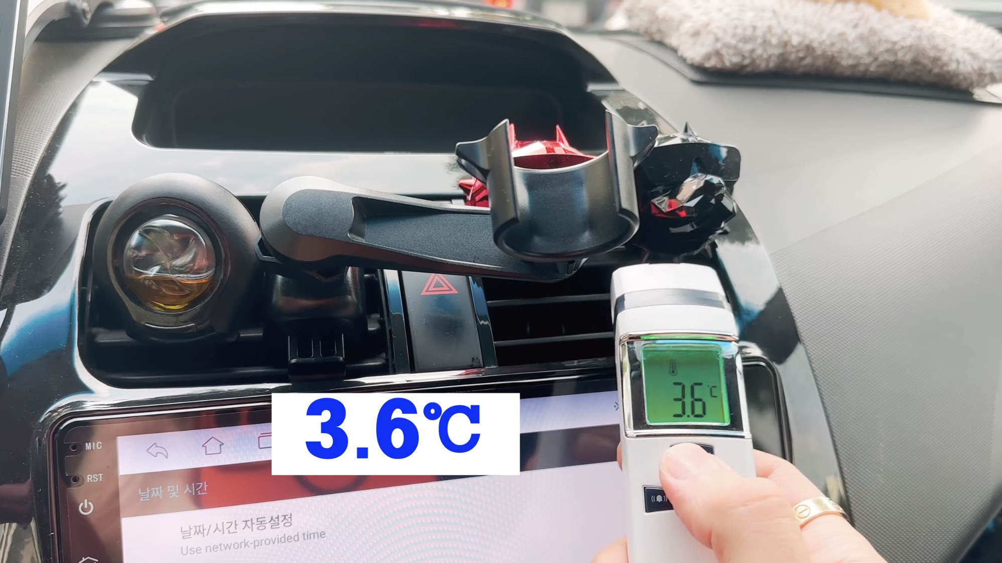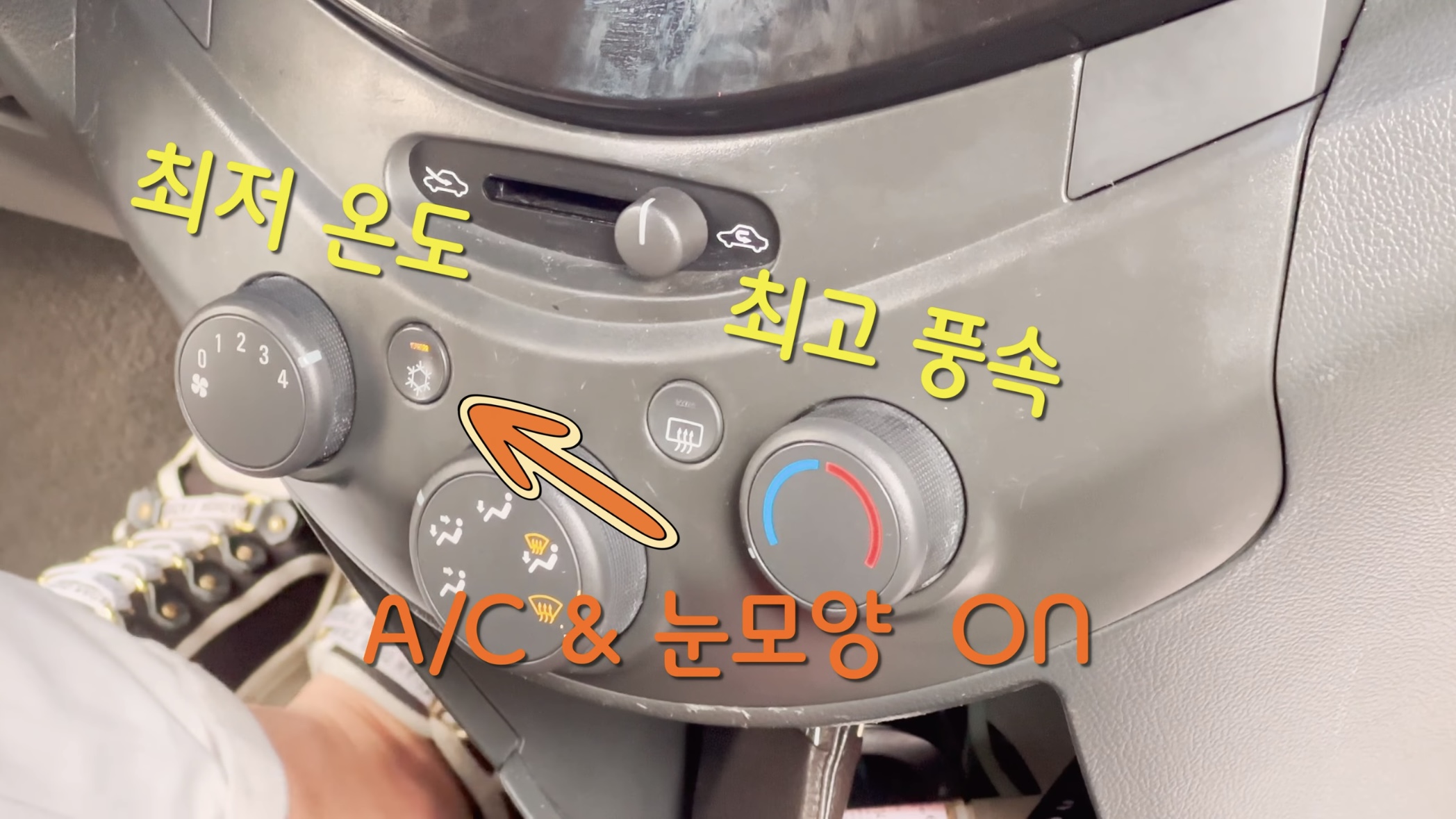 5. 시동을 걸고 에어컨을 켜고 최대풍속, 최저온도로 설정한다.